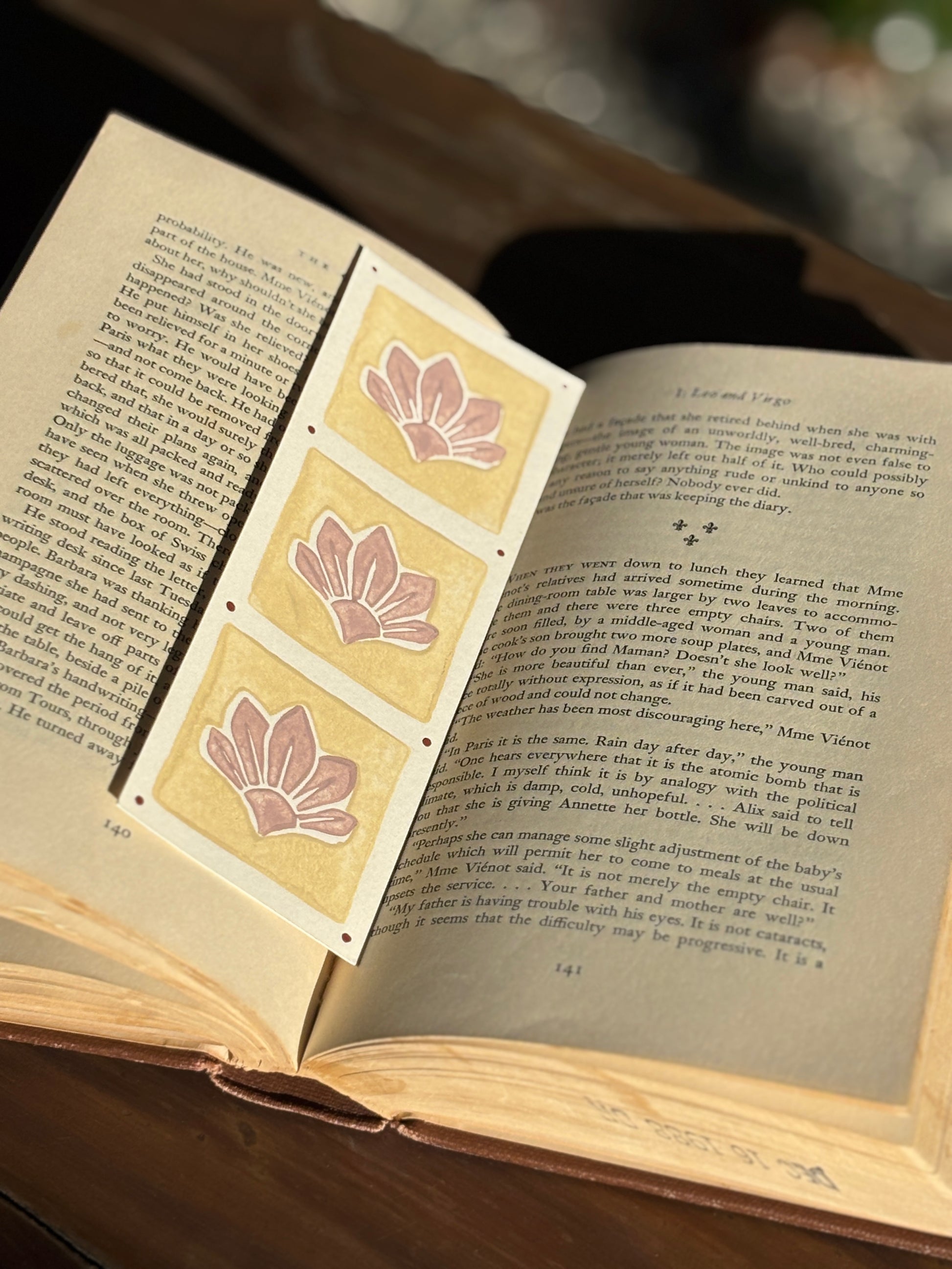 - hand block-printed on 2.5″ × 7″ smooth, 100lb acid free paper.